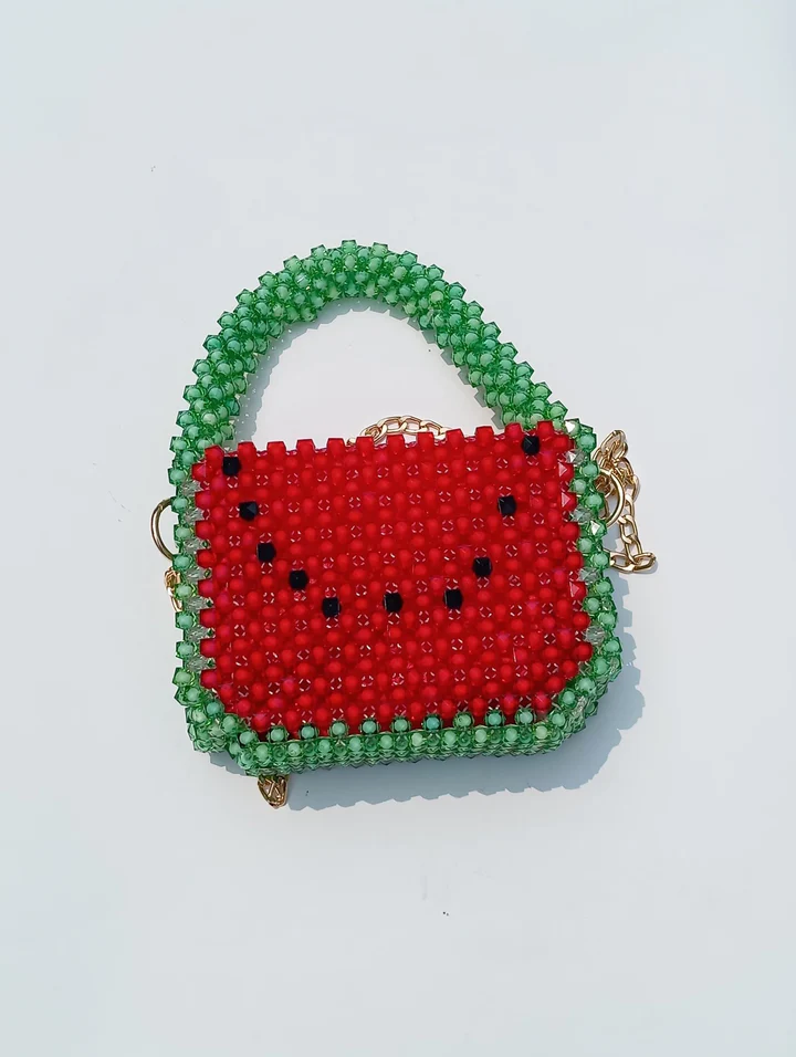 Add a burst of freshness to your wardrobe with our Aura Melon Beaded Bag, a playful and vibrant piece that’s perfect for summer vibes or standout styling. Handcrafted with care, this unique bag is intricately woven using original pearls and beads to resemble a juicy watermelon slice – complete with a glossy red body, leafy green borders, and black bead “seeds.”