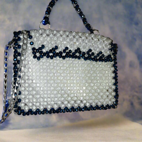 Turn heads with timeless sophistication. This Double Shade Beaded Handbag is carefully handcrafted with transparent crystal-like beads, outlined in deep blue accents for a luxurious contrast. The elegant wave pattern on the flap adds a subtle artistic flair, making it a standout accessory for both casual and formal occasions. Finished with a sturdy silver chain strap, this bag blends glamour with function – just the right size for carrying your small essentials like cards, lipstick, or keys.